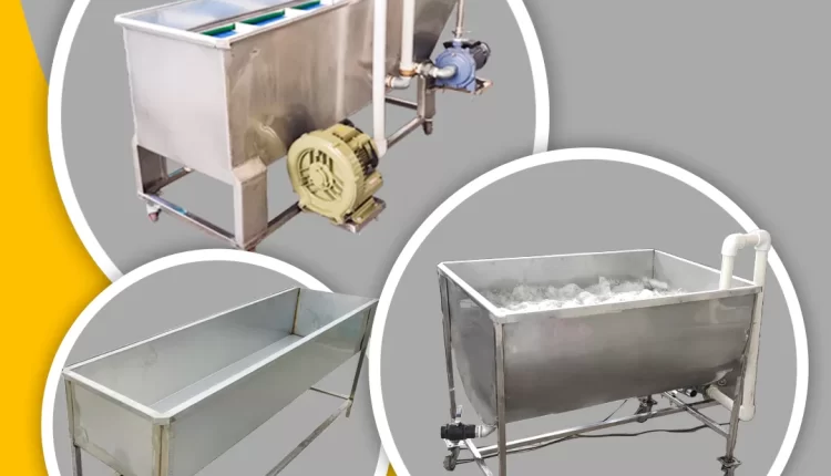 وان شستشوی دارای نوار بالابر: این وان ها شستشو را به صورت اتوماتیک انجام میدهند و دارای نوار بالابر انتقال دهنده هستند، برای این دستگاه ها موتور های آب و موتور های هوا به کار گرفته شده که باعث چرخش و شستشوی بهتر محصولات و بخاطر سیستم سیرکولاسیون باعث صرفه جویی در آب هم میشود. ظرفیت این وان ها از ۳۰۰ لیتر الی ۲۰۰۰ لیتر میباشد.